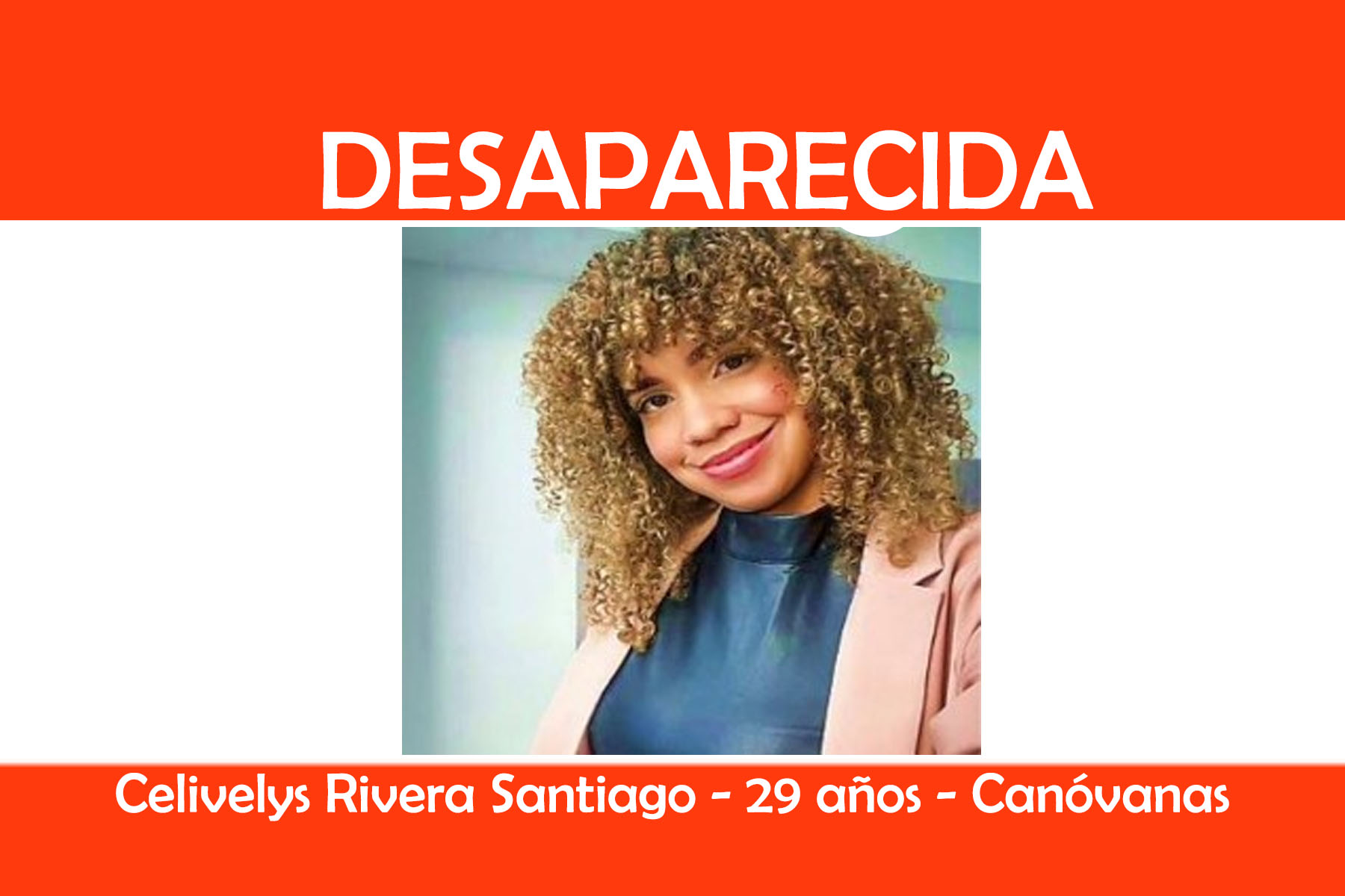 La desaparición de Celivelys Rivera Santiago, de 29 años, fue reportada por su esposo, Benjamín Rivera, descrita físicamente como de 5’2” de estatura, 95 libras de peso, tez trigueña, ojos marrones y cabello rubio. Al momento de su desaparición vestía un traje amarillo con flores azules y sandalias plateadas.