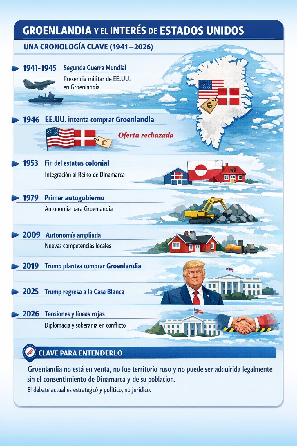 En 2026, declaraciones y movimientos diplomáticos reactivaron el debate, con Dinamarca reiterando que la soberanía sobre Groenlandia no está en negociación, mientras aliados de la OTAN observan con atención el aumento de tensiones en el norte del Atlántico .