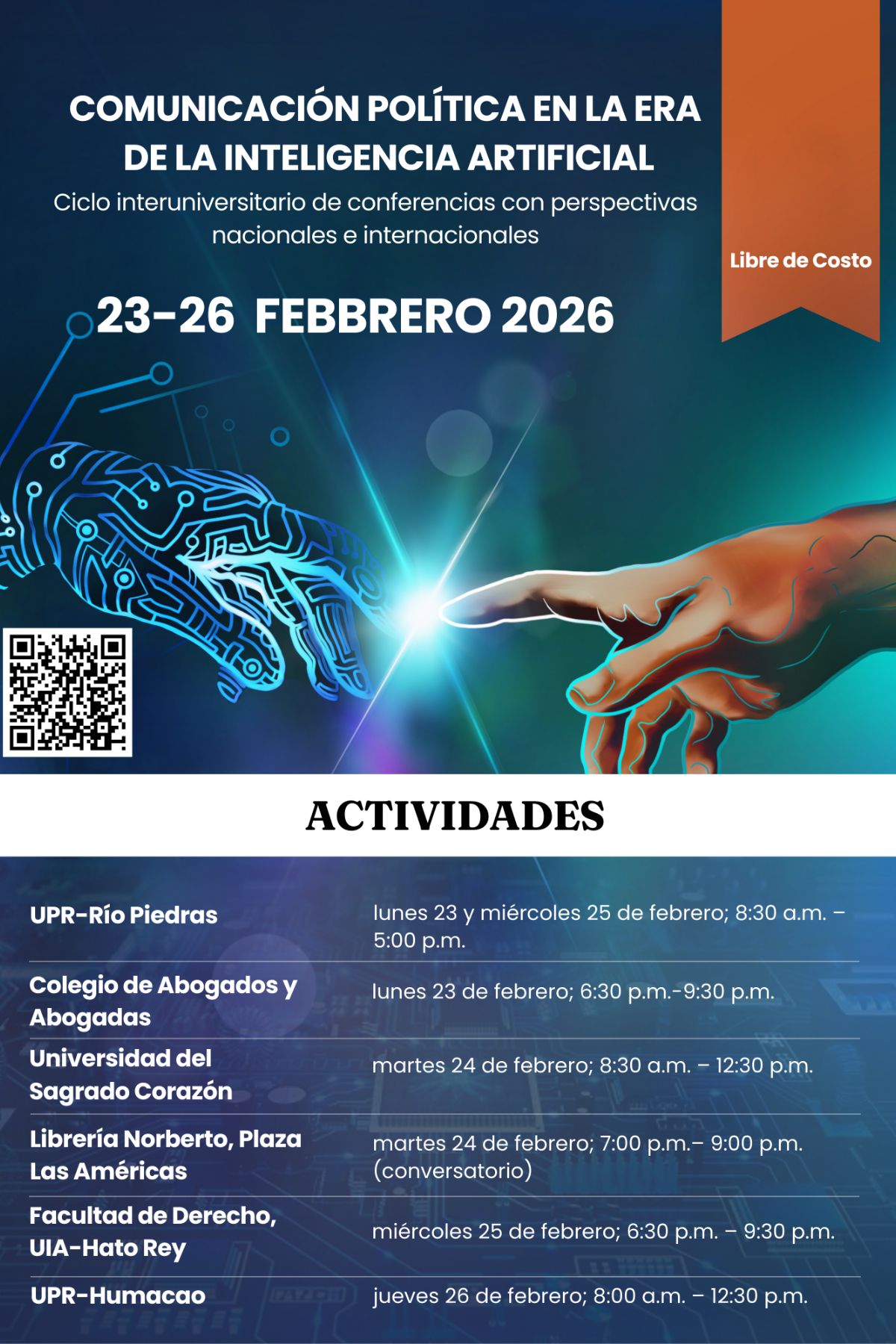 Esa misma noche, el ciclo se trasladará al Colegio de Abogados y Abogadas de Puerto Rico con el panel Aspectos legales y éticos del uso de la inteligencia artificial en campañas electorales y propaganda gubernamental, centrado en los desafíos jurídicos, la regulación emergente y la protección de la democracia.